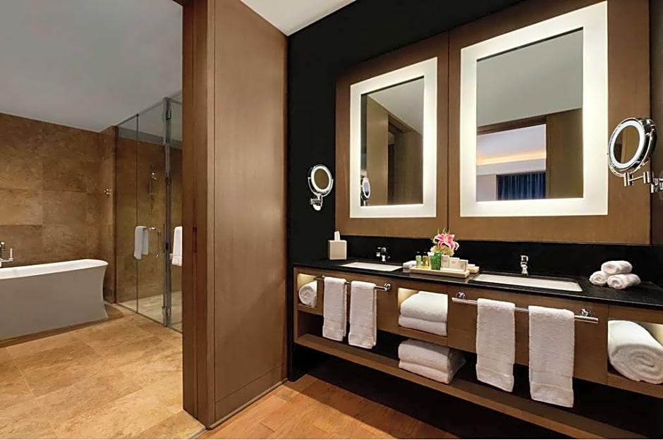 Executive Lounge access, separate living and dining area, kitchenette, WiFi An epitome of luxury and elegance, this spacious Presidential Suite features insulated floor-to-ceiling windows, four ambiences, a separate living area, dining area with table that seats 8 and lounge area next to the king bedroom. Freshly cooked meals are easy with a generous kitchenette. Enjoy access to the top floor Executive Lounge where you can start the day with breakfast followed by canapés, afternoon tea, blended infusions and beverages throughout the day at the outside terrace. Stay connected with complimentary WiFi access. Enjoy a good night's sleep on the king Hilton Serenity bed with down pillows, 200 thread-count triple sheets made with eucalyptus fibers and duvet cover. Refresh in the spacious marble bathroom's rain shower or tub with superb amenities.