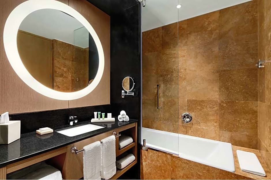 675sq. ft. King bedroom suite, wooden floors, insulated floor-to-ceiling windows and separate living room. Spoil yourself in this oversize suite, with spacious living room, and working areas with Herman Miller ergonomic chairs. Enjoy exclusive benefits designed on measure to guarantee an outstanding experience full of facilities. It includes full mini-bar, one daily drink and snack, no room service delivery fee and special F&B discounts. Take advantage of one hour daily meeting room and 4PM late checkout, subject to availability. Stay connected with complimentary Premium WiFi and enjoy the king Hilton Serenity bed with down pillows, 200 thread-count triple sheets made with eucalyptus fibers and duvet cover. Refresh in the marble bathroom's rain shower with luxurious amenities.